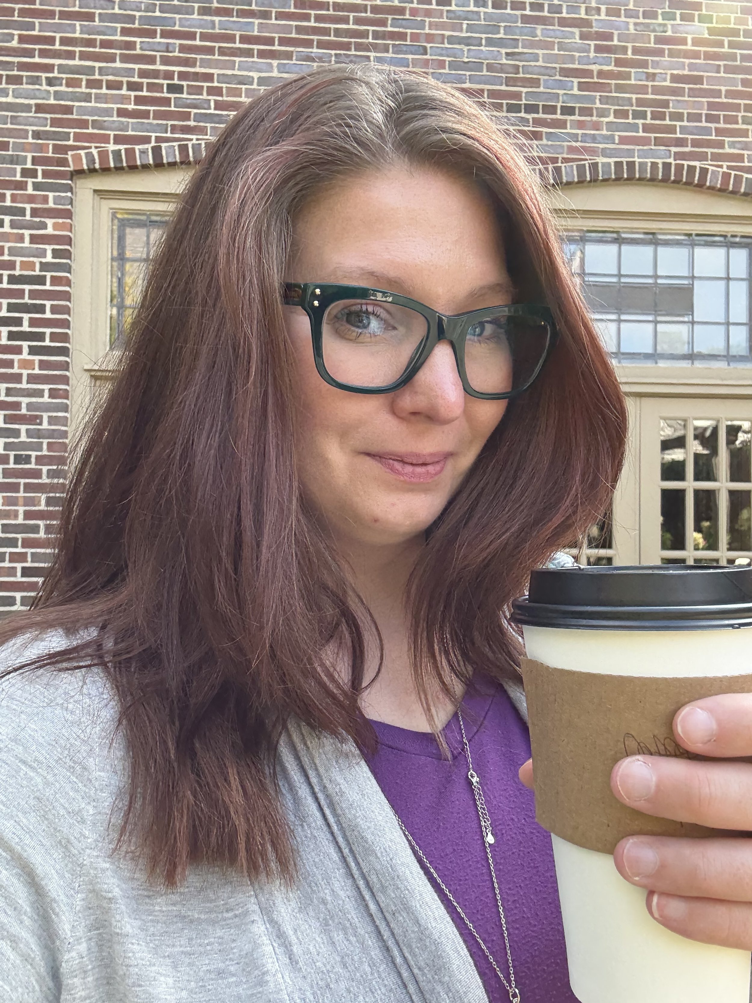 A woman with long reddish-brown hair wearing glasses and a purple shirt, holding a to-go coffee cup outside in front of a brick building with large windows.
